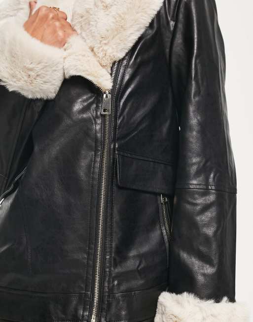 Black Faux Leather Faux Fur Trim Biker Jacket Black from