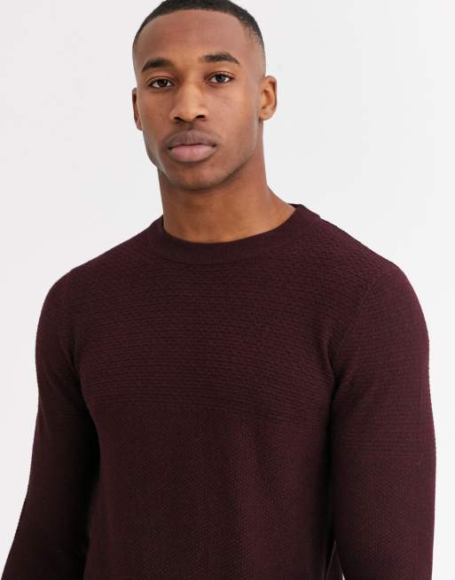Jack Jones Premium textured crew neck knitted jumper in burgundy
