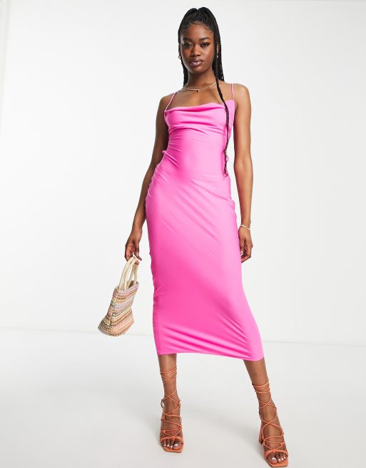 In The Style exclusive satin cowl neck midi dress in pink ASOS