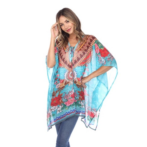 Women s Short Caftan With Tie up Neckline Blue One Size Fits Most