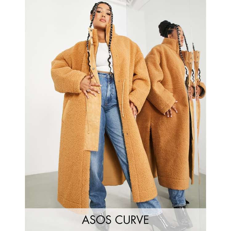 ASOS EDITION Curve borg funnel neck coat with drawstring in camel