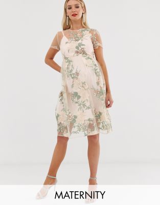 Chi Chi London Maternity embroidered midi dress with sheer overlay