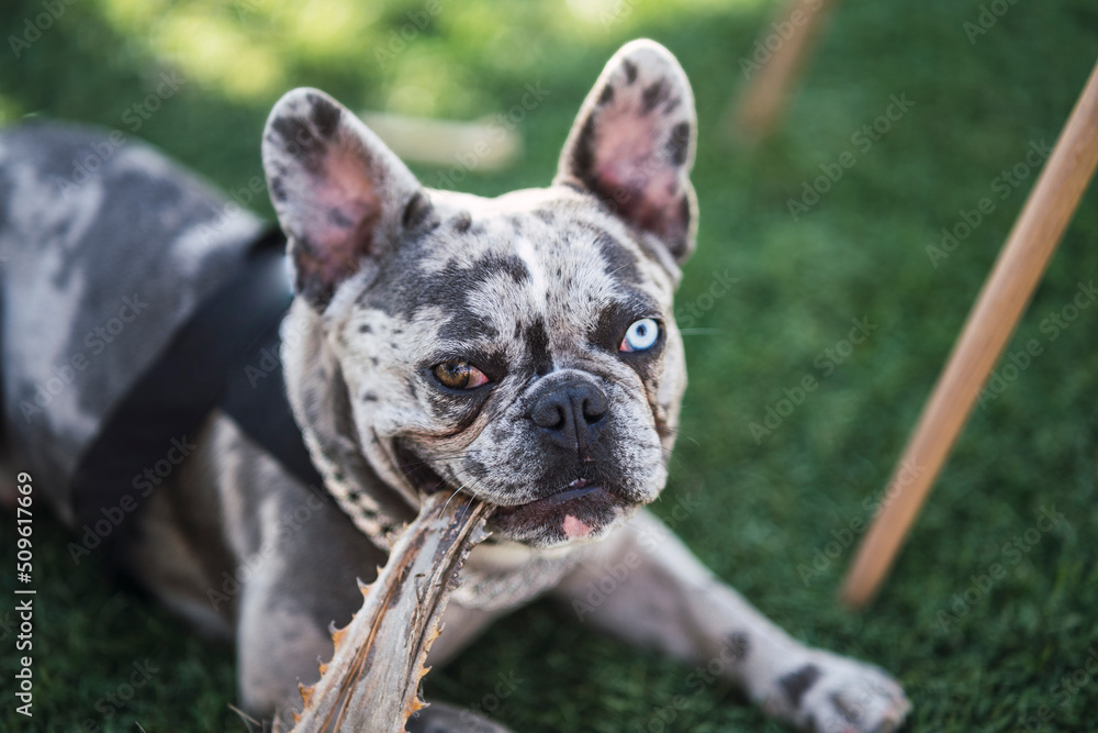 Bulldog franc s merle con un ojo de cada color sentado y en el