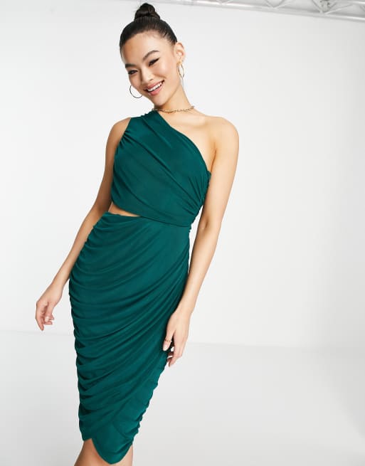 Rare London ruched one shoulder dress with cut out in emerald green