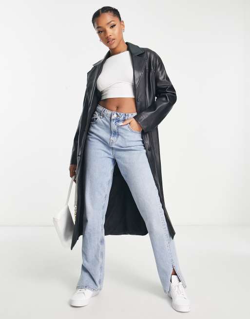Faux leather sale duster coat, Black Shoulder Padded Faux Leather Longline Coat PrettyLittleThing sale