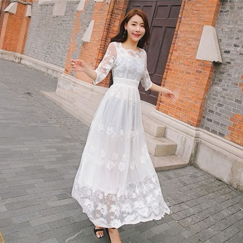 white dress women Flower lace Beach Summer new style long Korean dress HTZj