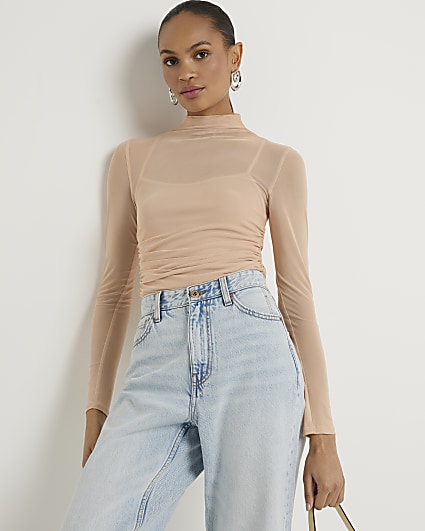 Shiloh Nude Black Polka Dot Long Sleeve Ruched Front Top