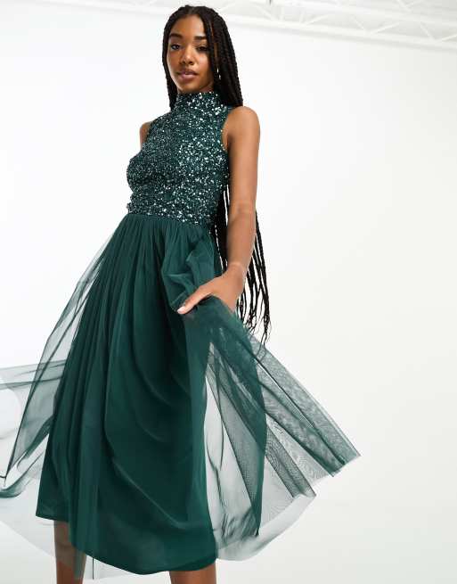 Maya Tall Bridesmaid high neck delicate sequin midi dress in emerald
