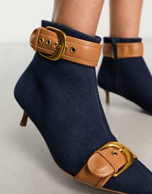 ASOS DESIGN Riley buckled kitten heel boots in blue denim