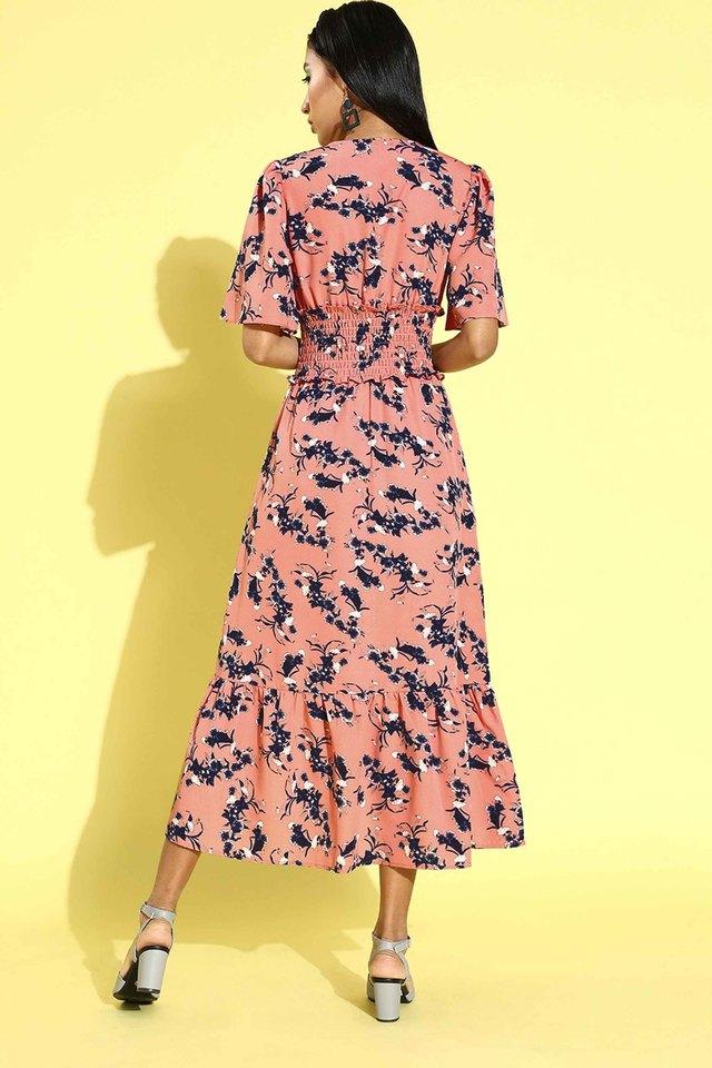 Women Floral Print V Neck Puff Short Sleeve Boho Summer Beach Midi