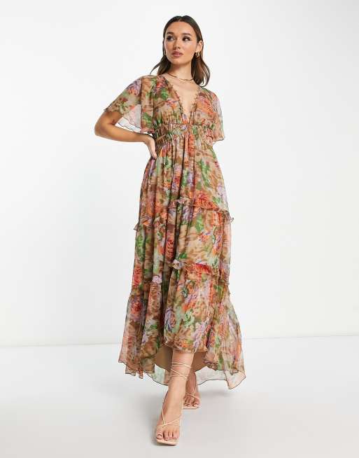 ASOS DESIGN angel sleeve plunge tiered maxi dress with cut out and rouleux detail in blurred floral print