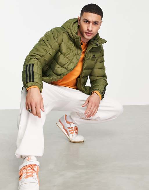 adidas Outdoor puffer jacket with hood and three stripes in khaki