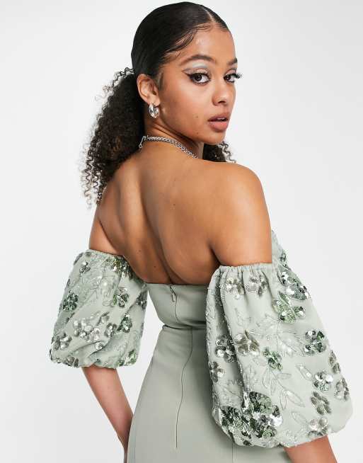 Asos bardot sale, ASOS DESIGN Tall bardot puff sleeve midi dress with floral embellishment in dusty green sale