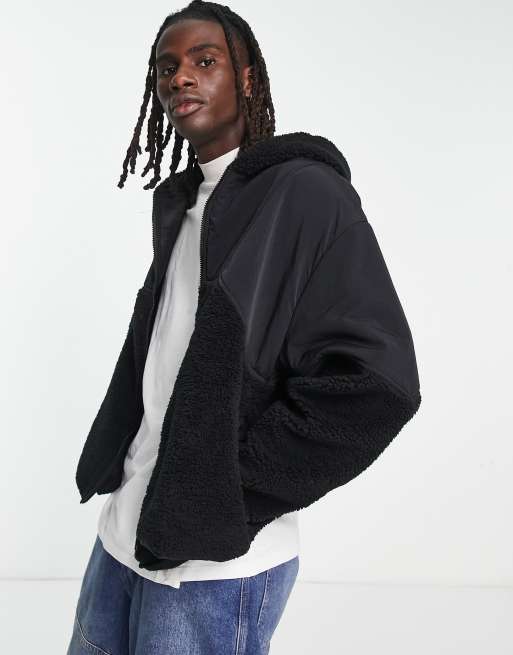 ASOS DESIGN oversized zip through hoodie in black nylon borg