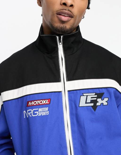 ASOS DESIGN motocross bomber jacket with badging in blue and white