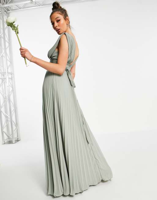 ASOS DESIGN Bridesmaid pleated cami maxi dress with satin wrap waist in olive