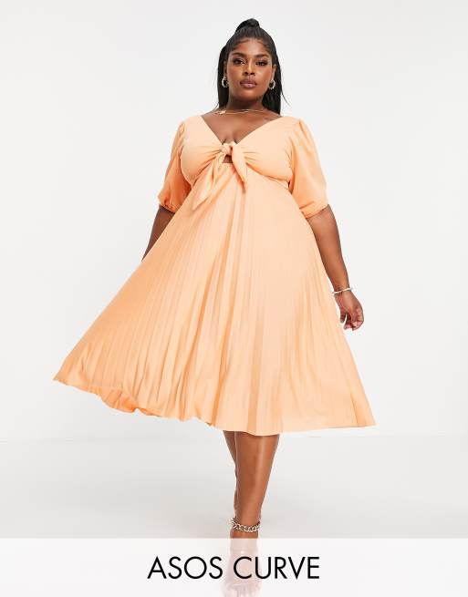 ASOS DESIGN Curve pleated front tie puff sleeve midi skater dress in coral
