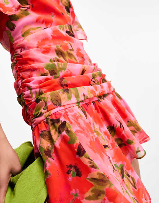 ASOS DESIGN wrap front chiffon mini dress with ruched side and peplum hem in pink floral