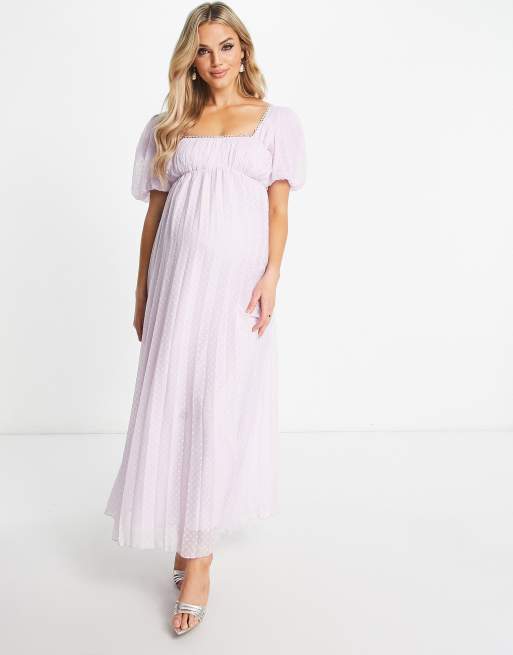 ASOS DESIGN Maternity puff sleeve pleated dobby midi dress with scallop trim in lavender