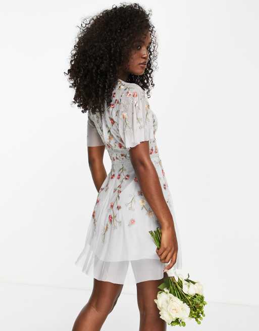 ASOS DESIGN Bridesmaid floral embroidered flutter sleeve mini dress with embellishment in soft blue