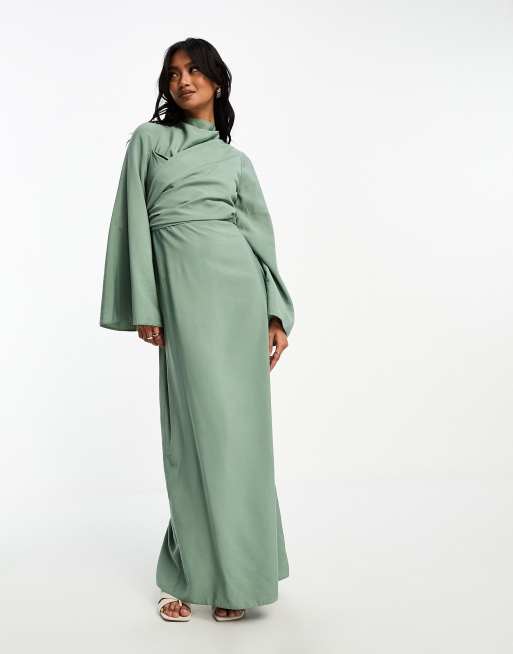 ASOS DESIGN Hochgeschlossenes Maxikleid in Salbeigr n mit gewickelter Taille und ausgestellten rmeln