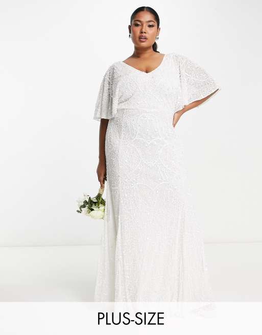 Asos plus sale size bridal, Beauut Plus Bridal allover embellished beaded maxi dress with frill detail in white sale
