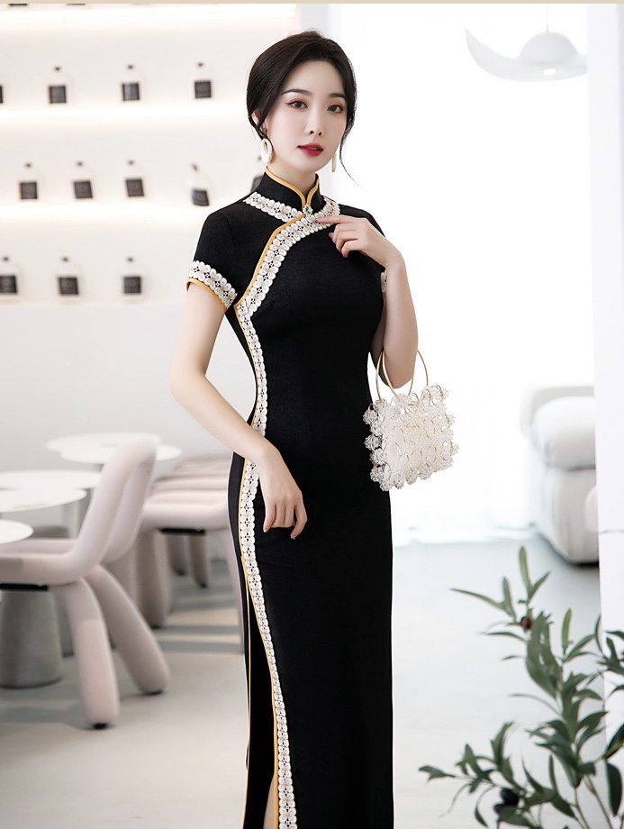 Fashion Ladies Lace Cheongsam Long Black Party Dress chinese