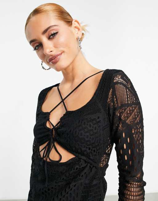 ASOS DESIGN crochet long sleeve tie detail mini dress in black ASOS